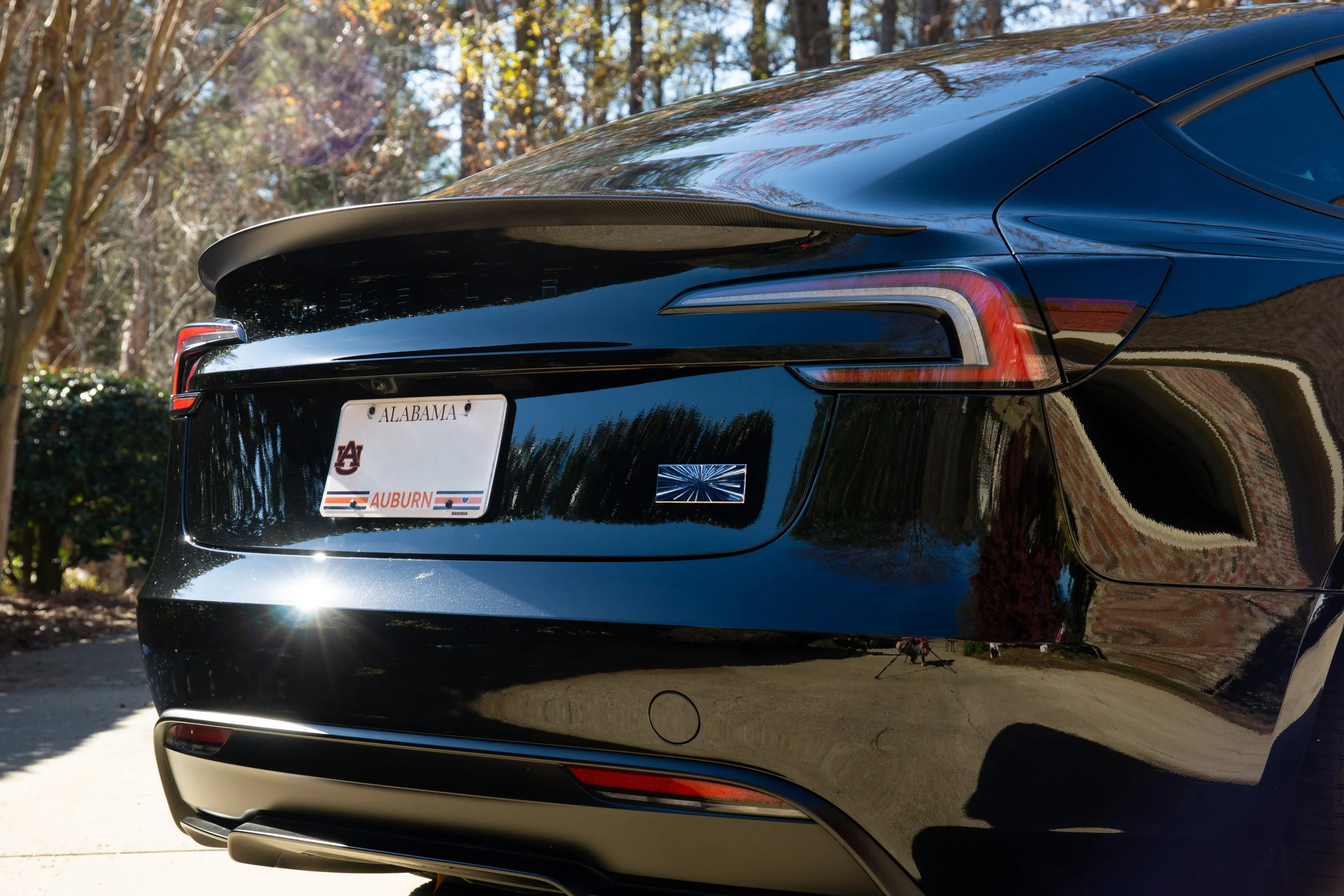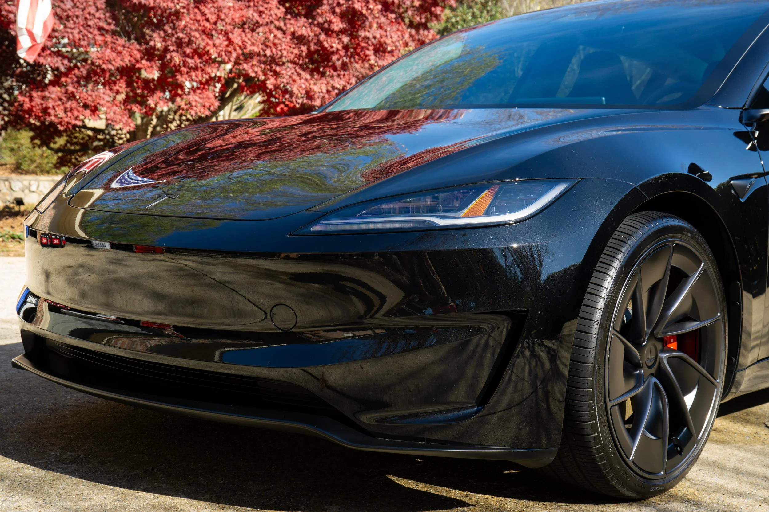 A shiny black Tesla electric car parked on a driveway with trees and bushes in the background.