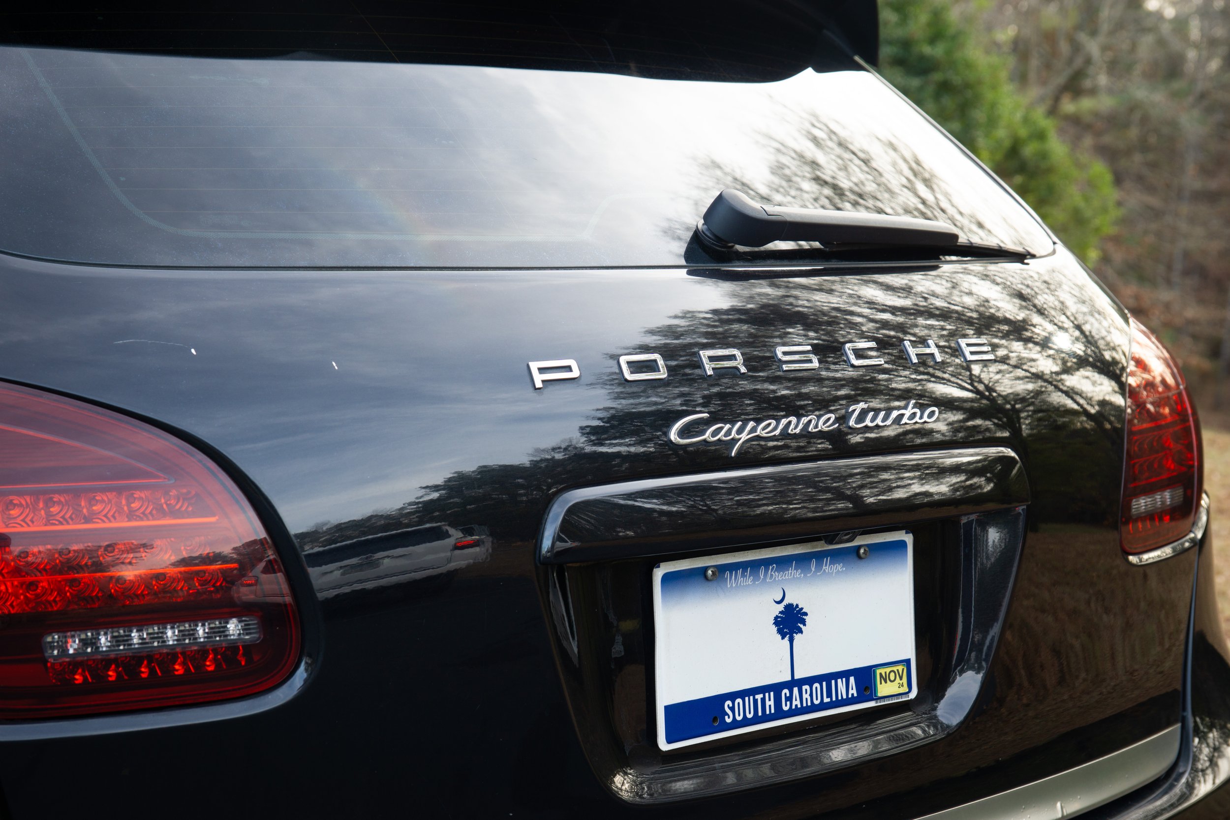 Close-up of the rear side of a light blue sports car with a black spoiler, parked on the pavement, with bushes and trees in the background.